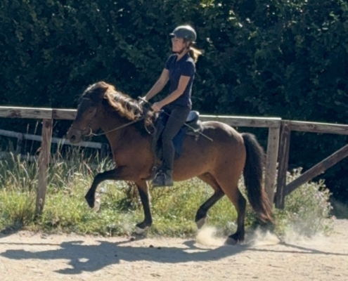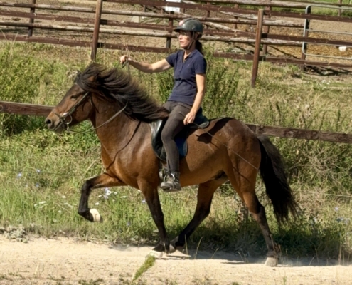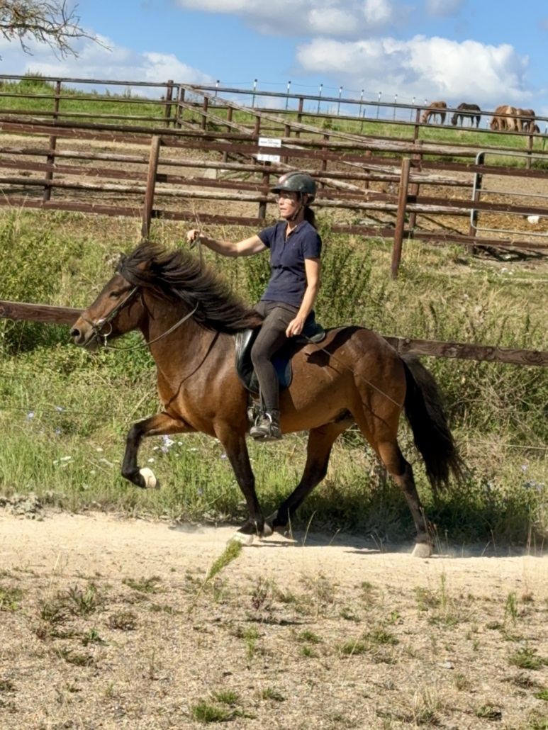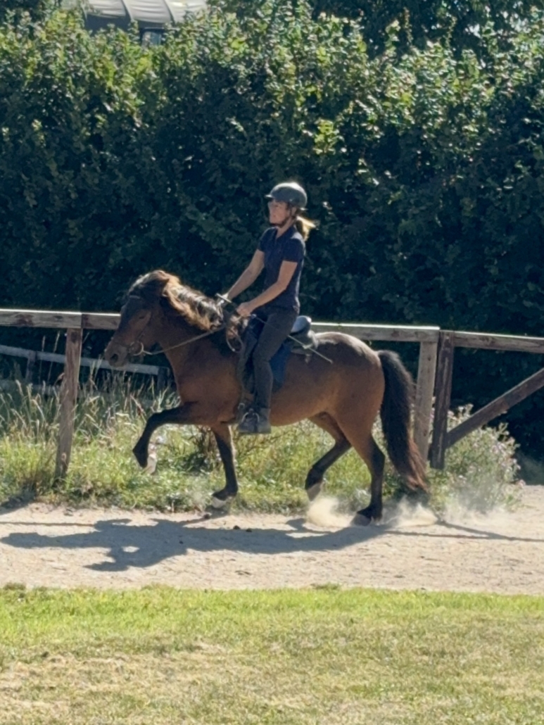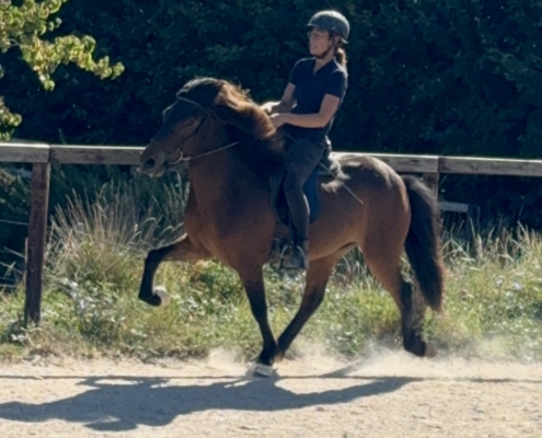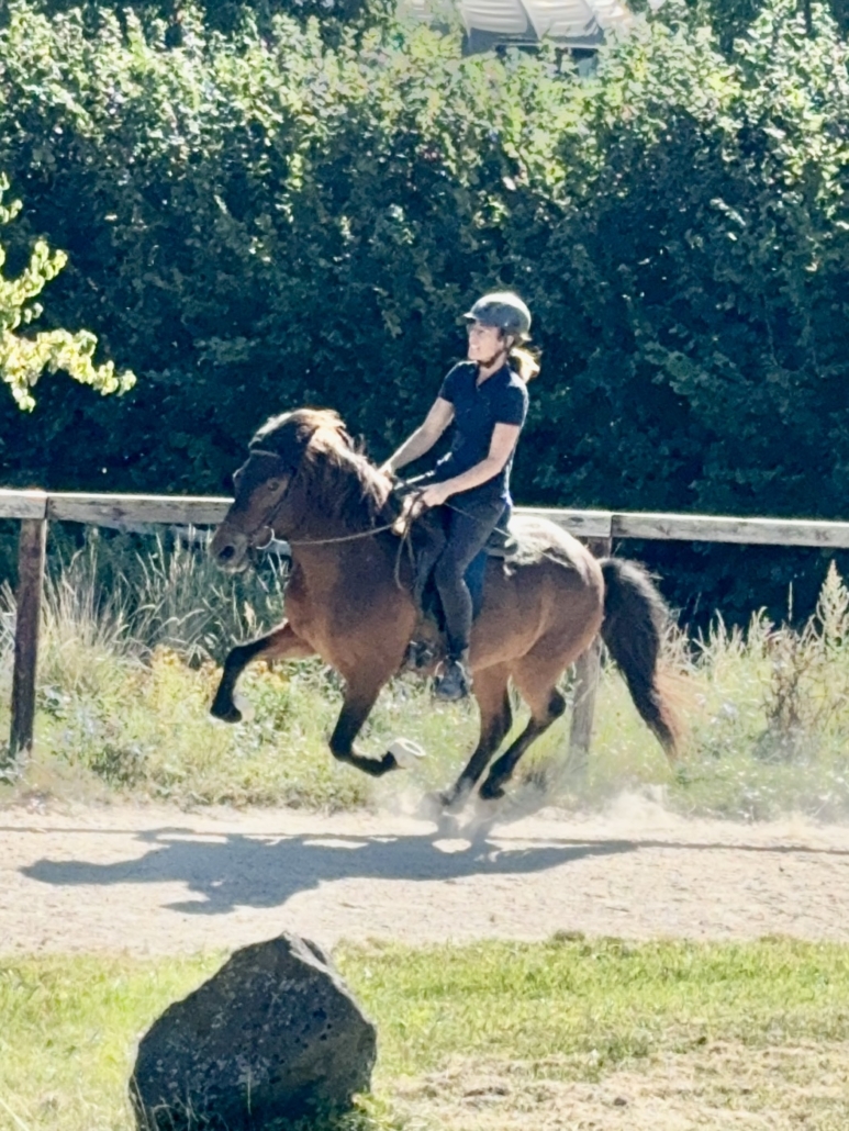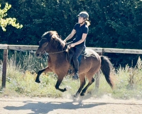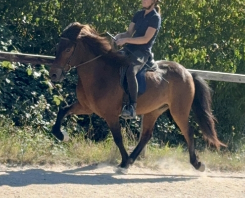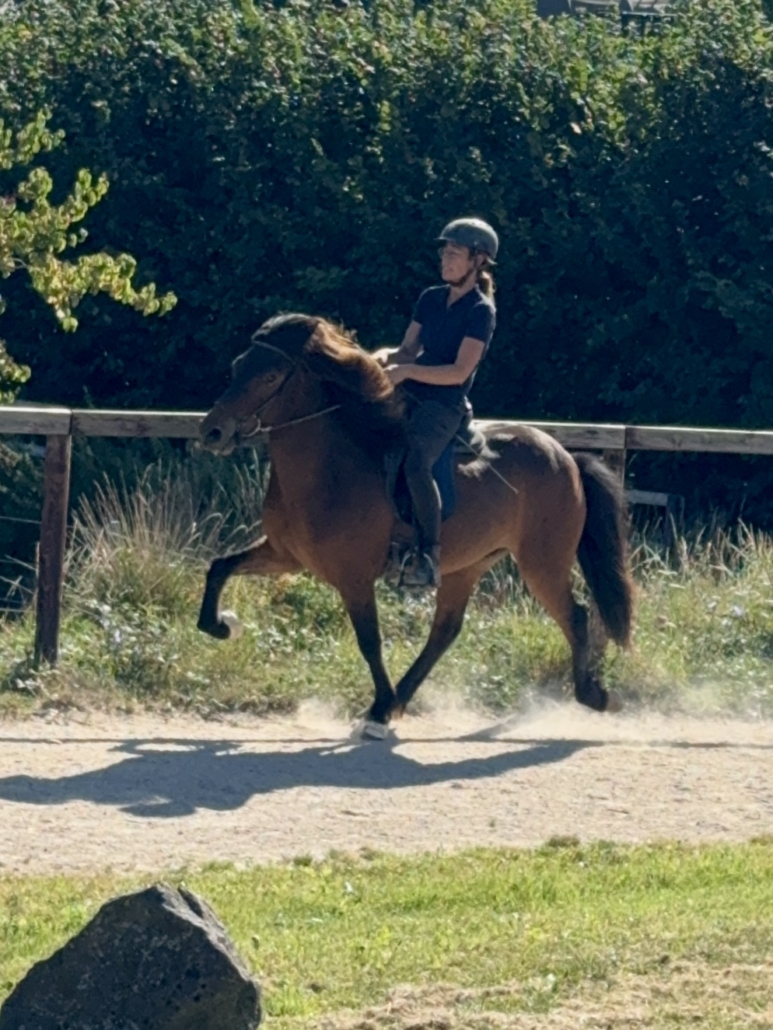Kjarnar ist ein ganz toller Tölter. Er töltet locker und akzentuiert, mit sehr schöner Bewegung und Form, und beherrscht auch den Aufgabenteil „Tölt am losen Zügel“ schon ganz hervorragend. Kjarnar ist sehr einfach und unkompliziert zu tölten und super bequem zu sitzen. Ein echter Töltgenuss, gepaart mit einer tollen Bewegung und Form, die zukünftig auf sehr schöne Noten im Turniersport hoffen lässt.